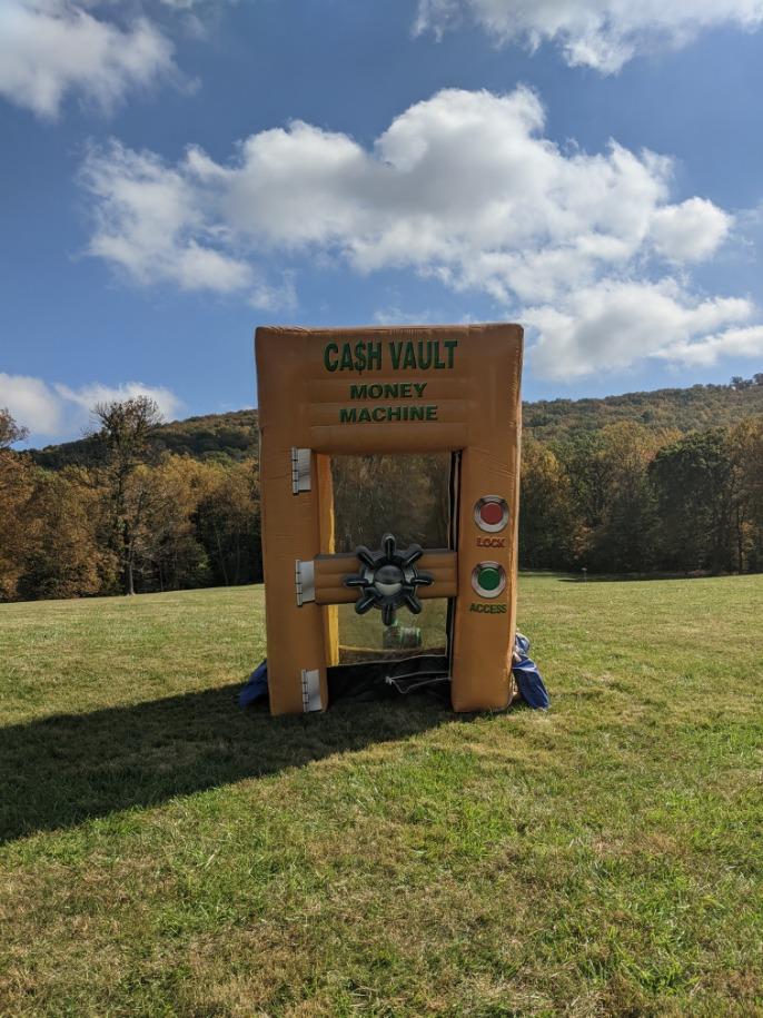 Resembling a bank vault in appearance, this cash vault/money machine will have patrons try to catch money, coupons, or whatever you’re promoting as it crazily dances about the inner chamber (courtesy of a secondary air-circulation system).